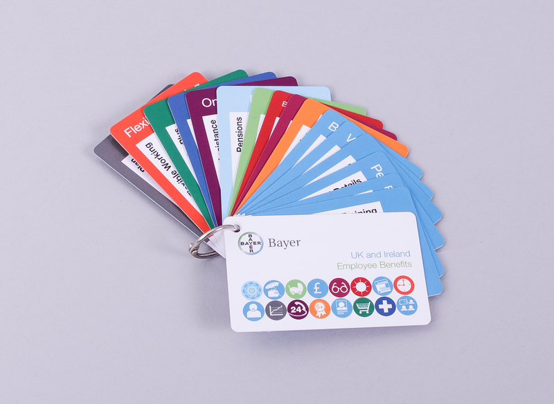 A set of bespoke plastic cards fixed by a ring. Great for employee benefits or other applications with a choice of responses.