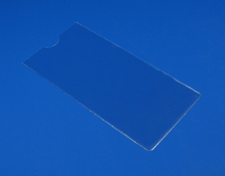 Made in 140mm dutas orange peel clear pvc.Open to short edge with thumbcut to centre. 2 radius corners to other short edge. Plain.